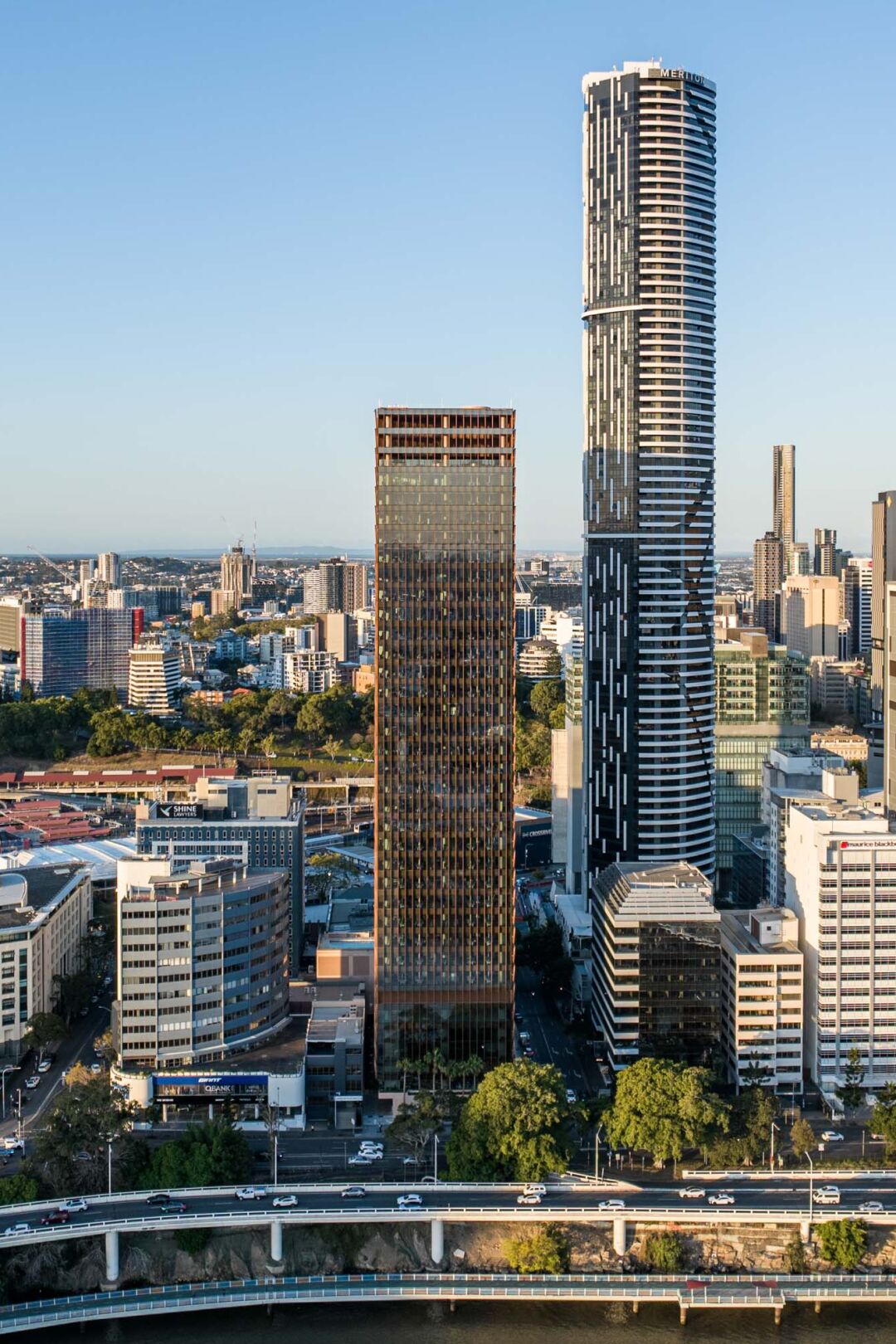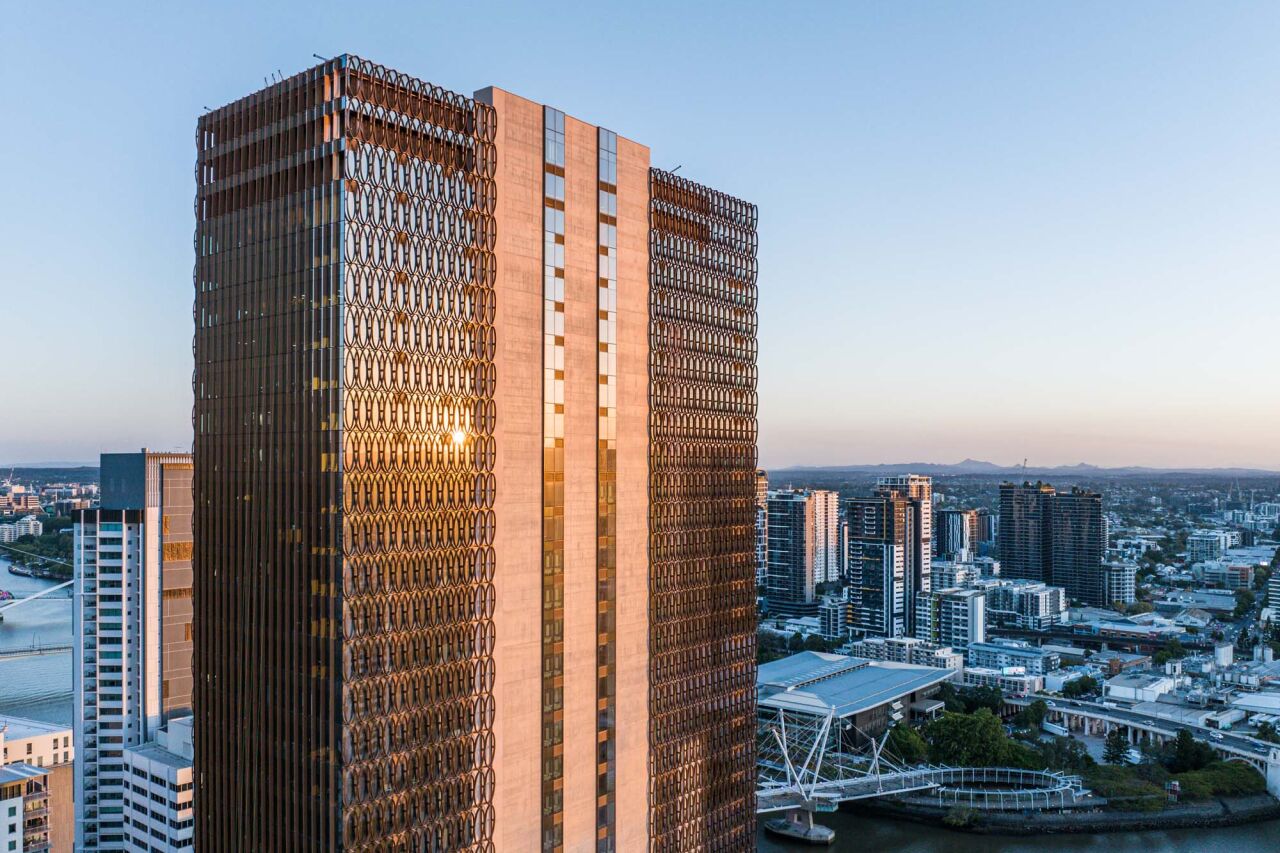 The tower targets a 6 Star Green Star rating and 5.5 Star NABERS Energy rating. A highly articulated façade manages solar exposure, while regenerative lifts, LED lighting and smart sensors support energy, water and waste efficiency. Biophilic design and panoramic river views enhance the experience, aligning with Brisbane City Council’s ‘Buildings That Breathe’ initiative.