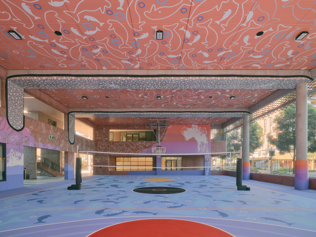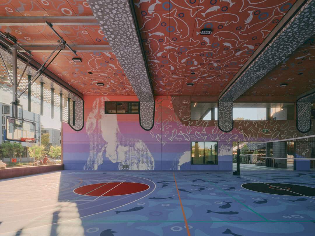 The ground floor of the school includes four multipurpose halls available for hire, a versatile games court, and a striking Indigenous mural titled ‘The Belly of the Feast’ by Archibald Prize-winning artist Blak Douglas, curated by Caroline Comino.