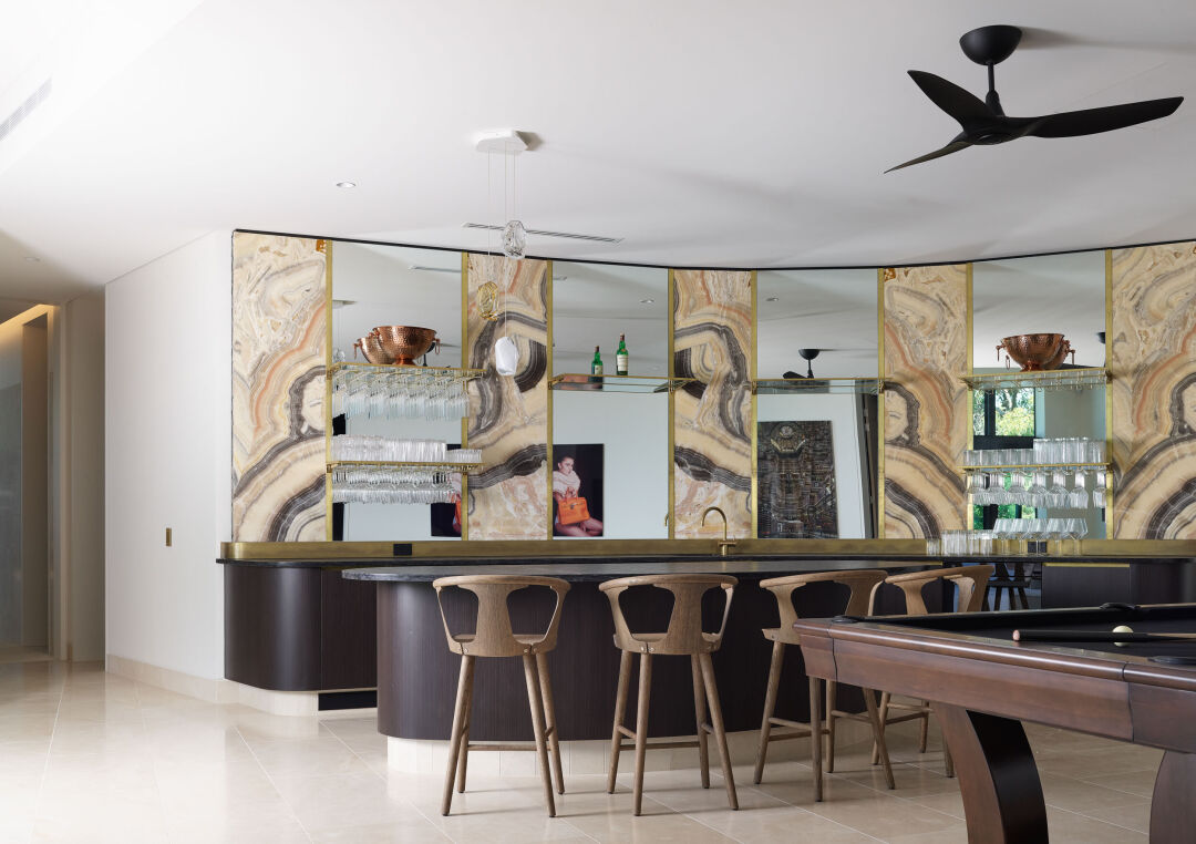 The upper level comprises a garage, carport, workshop, entry foyer and a separate apartment with access through the main entry. The middle level features living areas, five bedrooms and bathrooms, kitchen, butlers’ kitchen, cold room storage and powder room. The lower level showcases an entertaining area with a bar, cinema, gym, spa, steam room, sauna, ice bath plus an external entertaining area with a 25m pool.